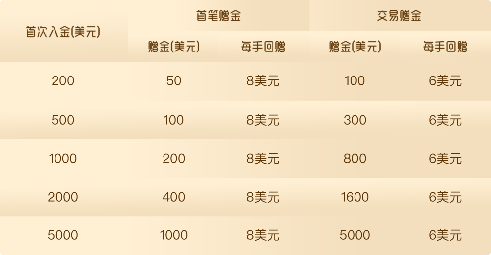新客户首次充值金额≥$200,联系客服报名参与本活动,成功登记后首笔赠金将发放至客户账户中,可直接用于交易。首笔赠金全部转换为可提取后即可开始领取交易赠金,活动最高可获得6000美元。